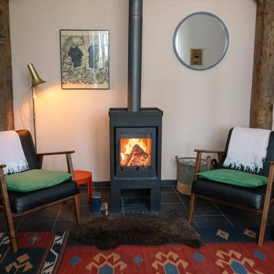 Gezellige woonkamer met houtkachel, boeken en spelletjes.