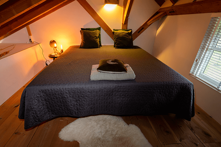 De slaapkamer voor 2 personen is boven, waar je met een stevige trap met leuning kunt komen. En via de glazen buitendeur beneden kom je op het privéterras waar je uitkijkt over het water en de landerijen.