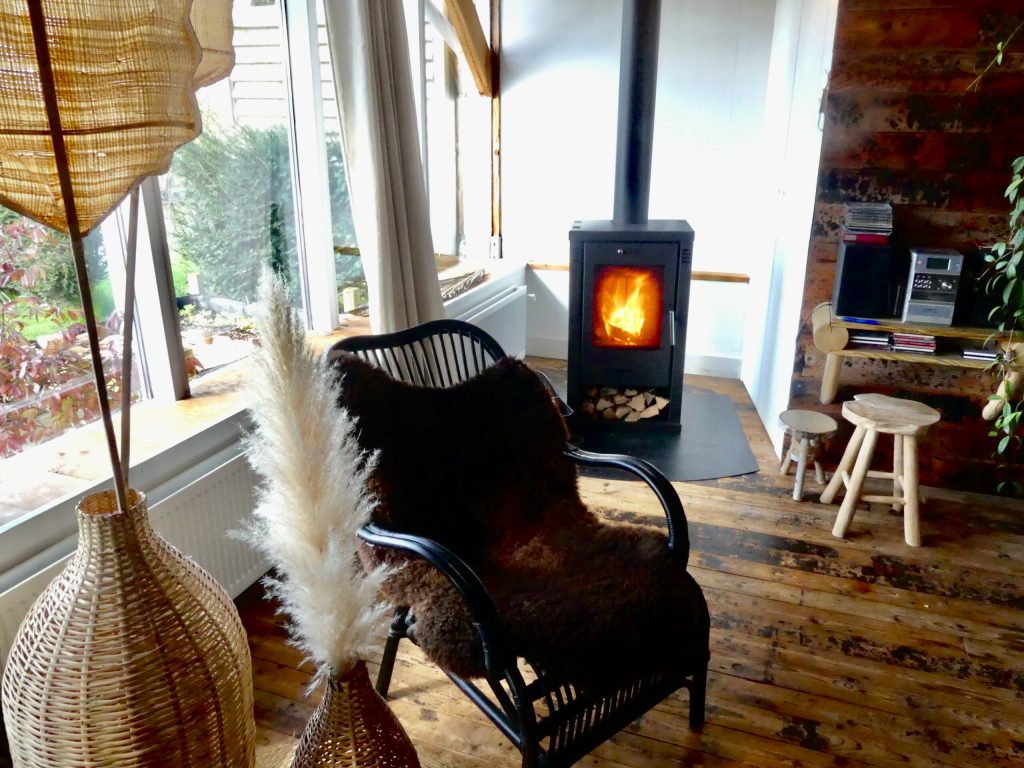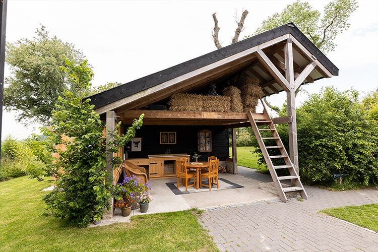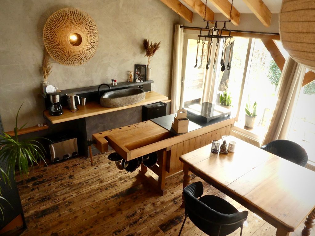De sfeervolle ruimte is voorzien van een zitgedeelte met bank en eenvoudig keukentje. Hier staat een koelkast met vriesgedeelte, elektrische kookplaat, koffieapparaat en een waterkoker. Er kan ook gebruikgemaakt worden van de buitenkeuken met gasfornuis en oventje.