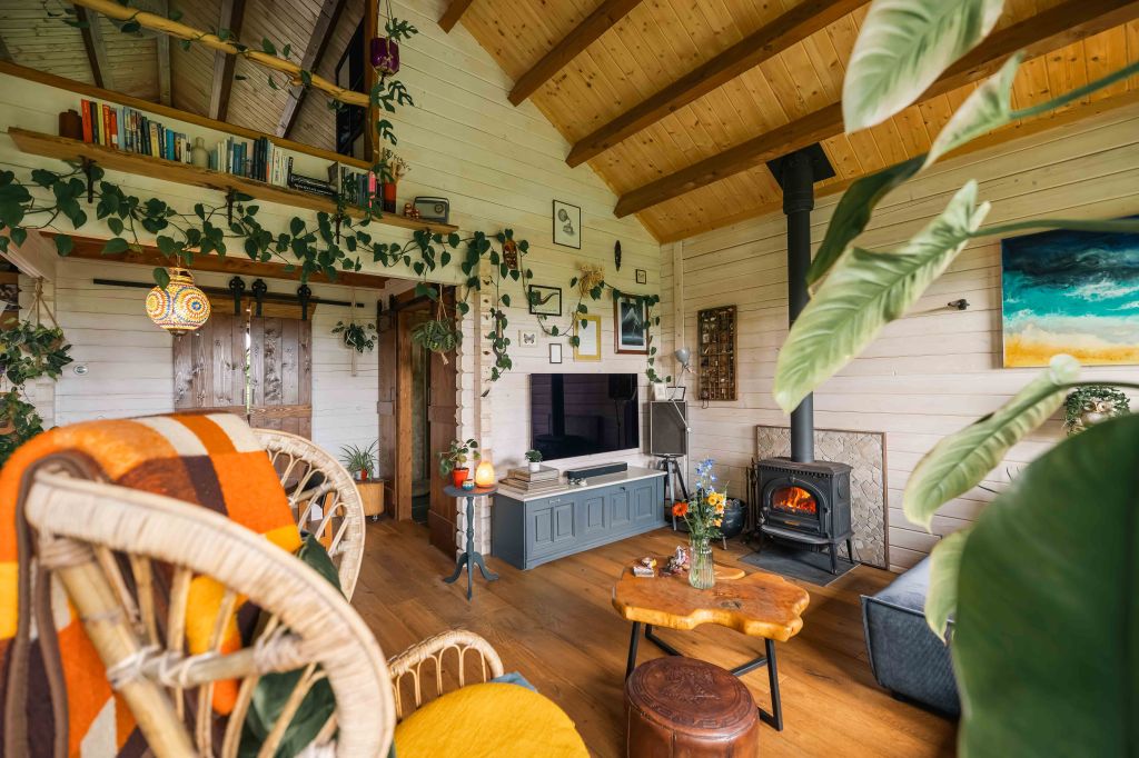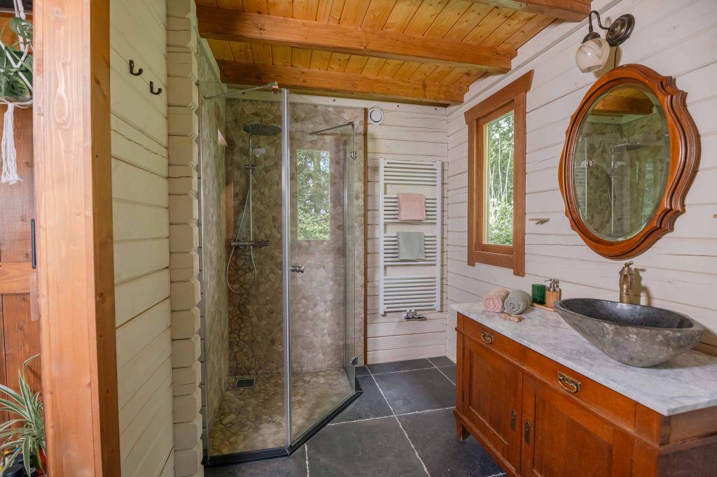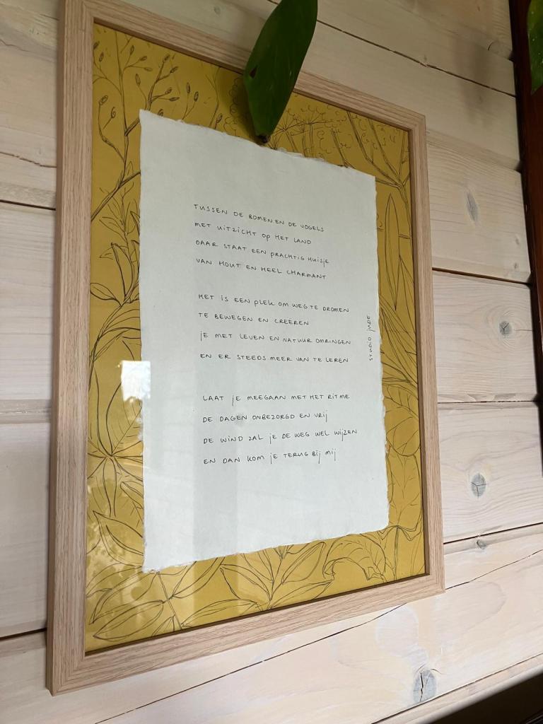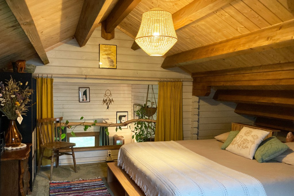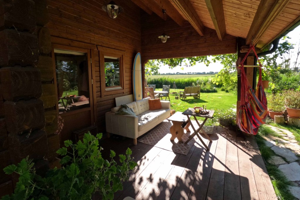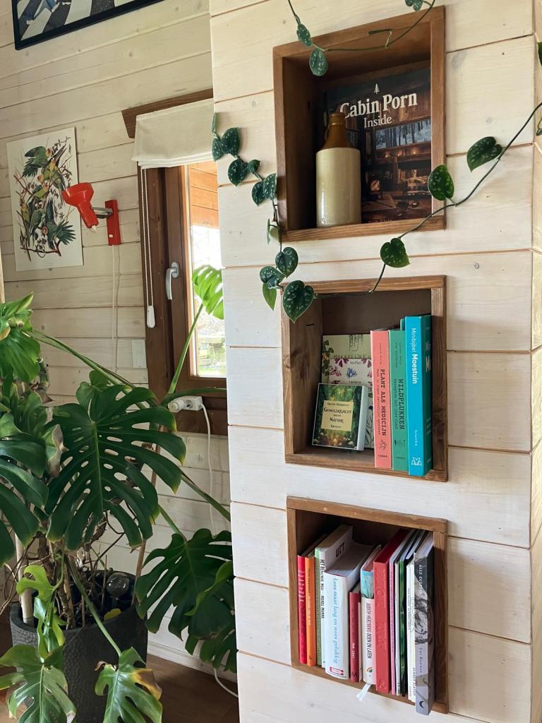 Het houten huis geeft een heerlijk geborgen gevoel. Echt een soort cocon, waarin je je kunt terug trekken.