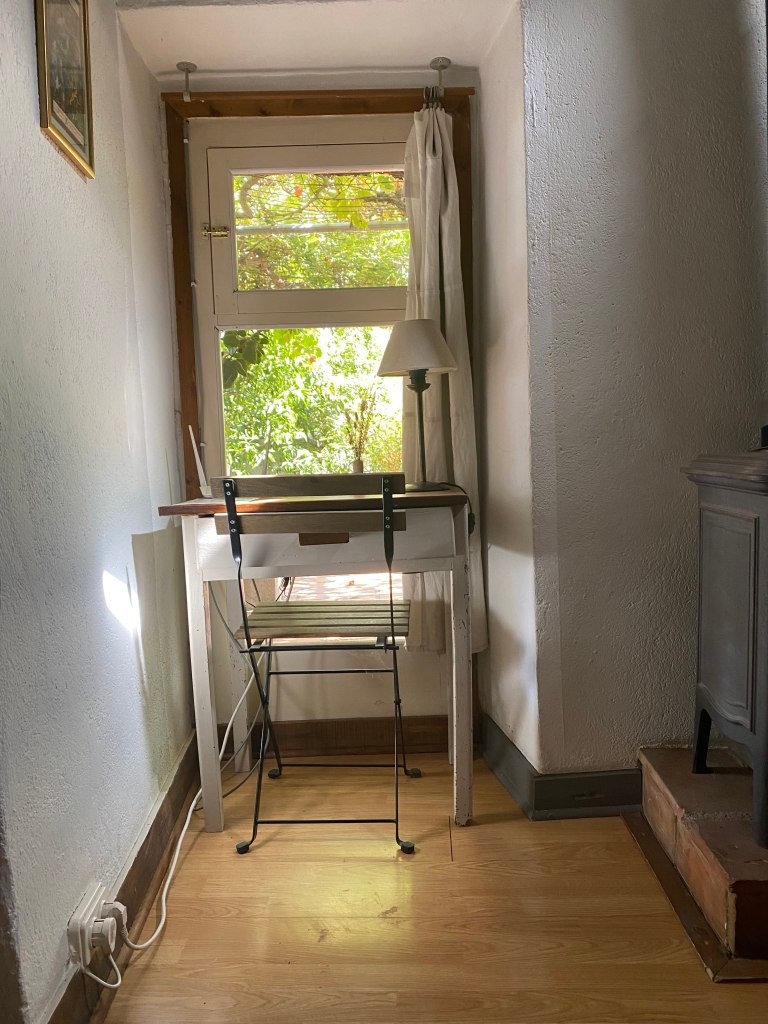 Let op: de schrijftafel in het huisje is wat klein. Wil je met z’n tweeën schrijven, dan biedt de buitentafel mogelijkheden.